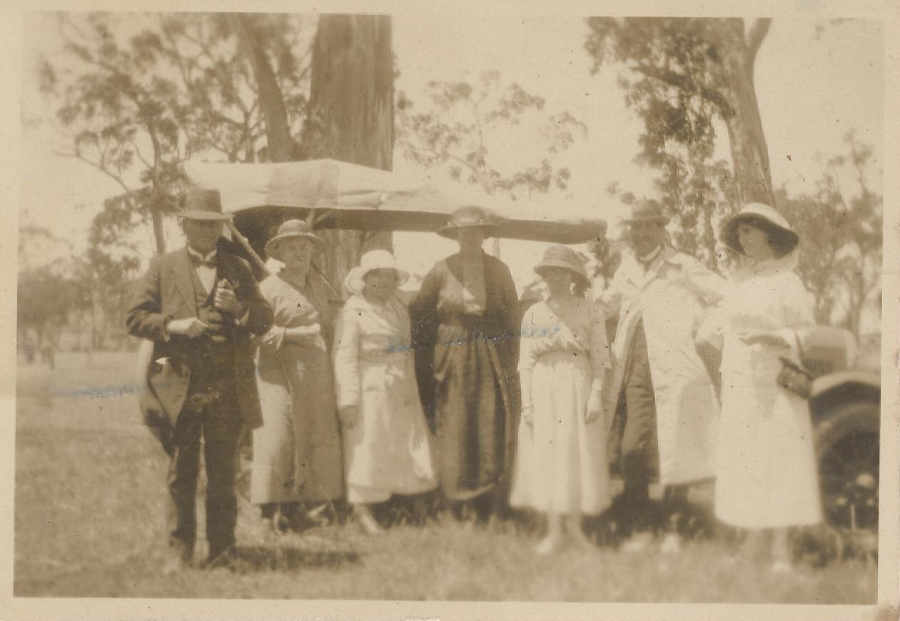 Adults in front of eucalyptus trees, with car behind, perhaps a Model T.