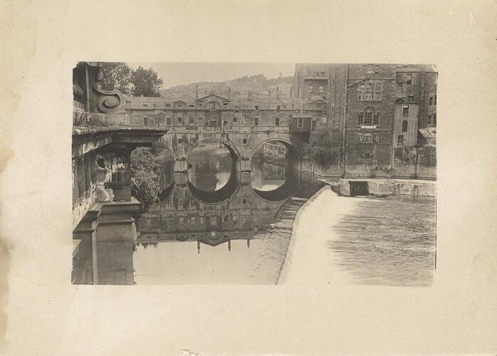 River through town, across which stretches a stone bridge with buildings upon it.