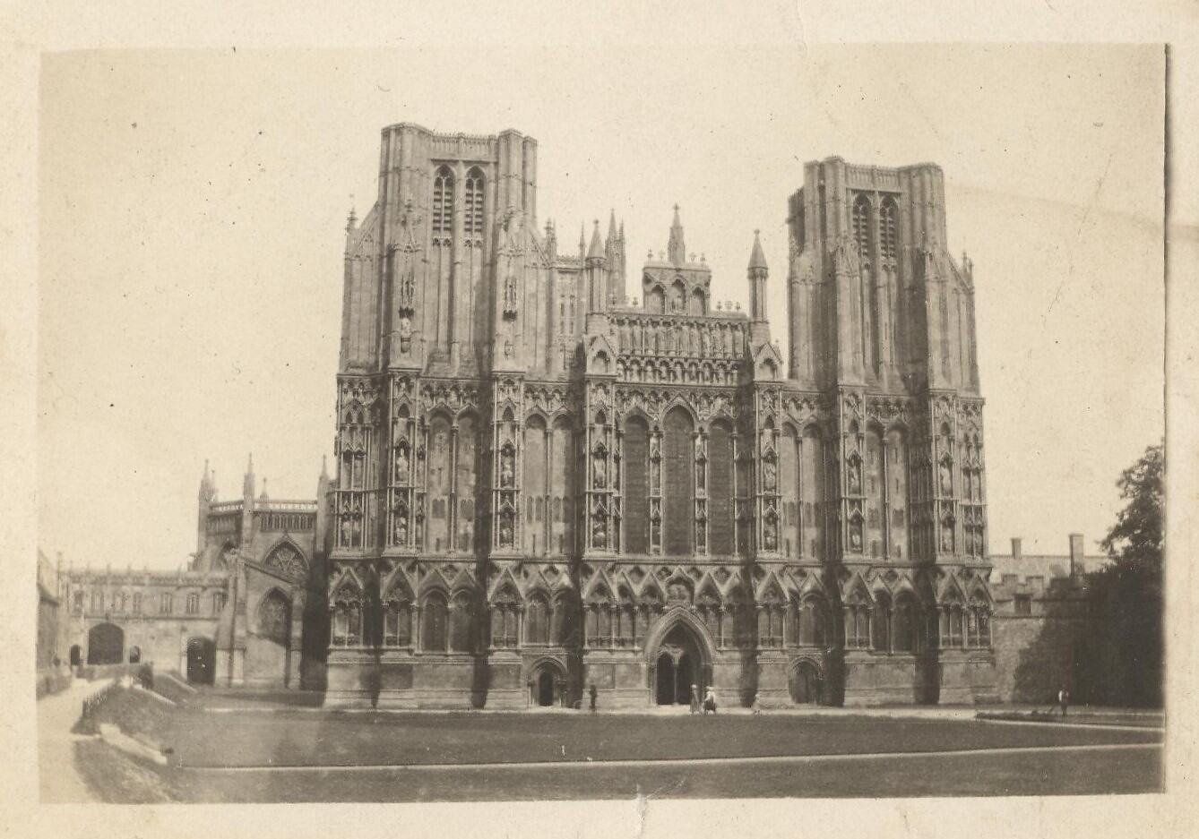 View of large cathedral with lawn in front.