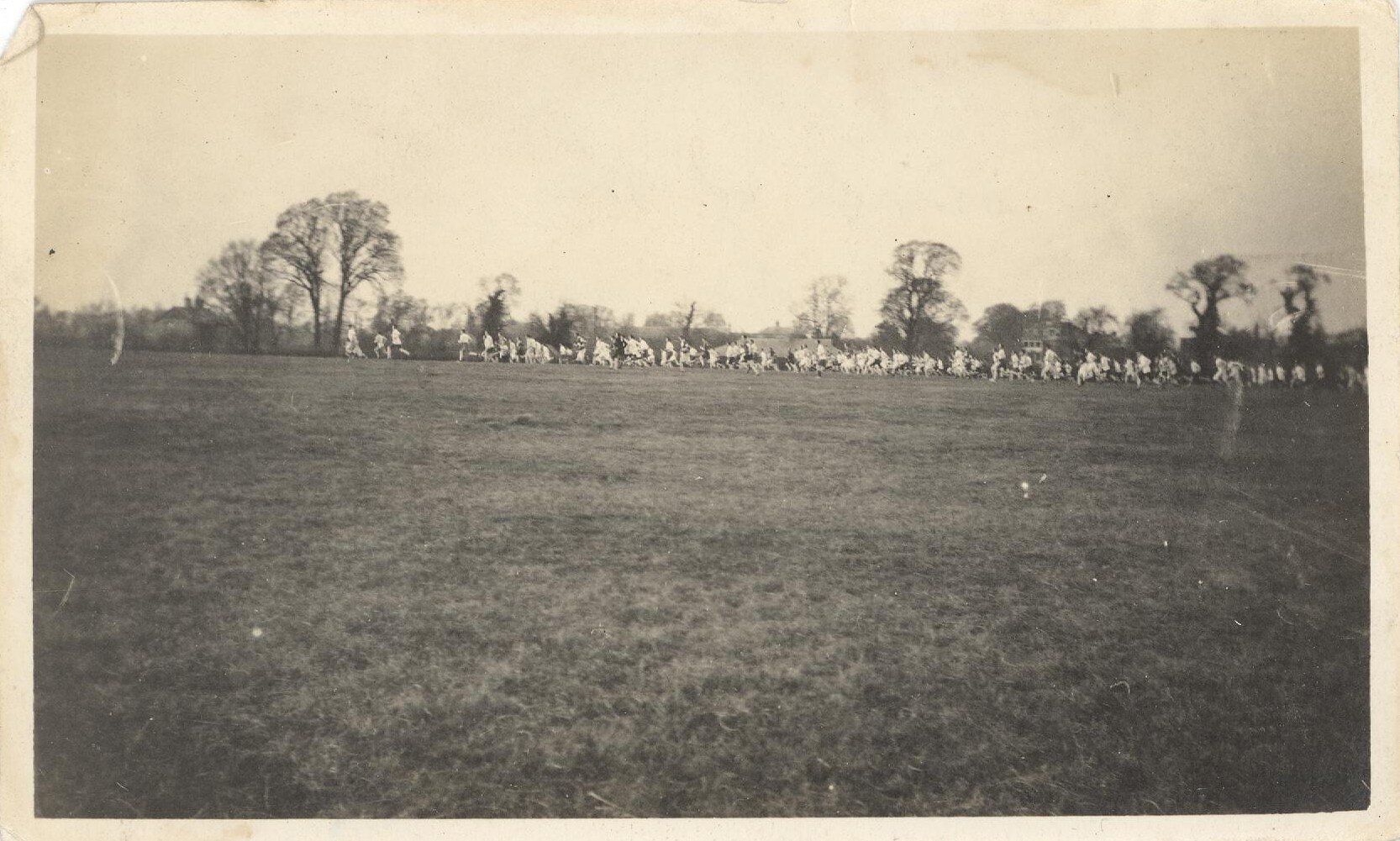 Large group of people, running across a field.