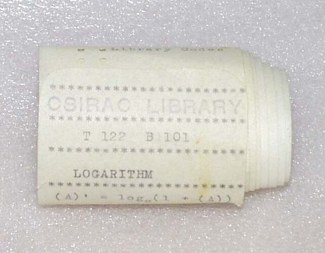 Roll of CSIRAC 12 hole paper tape Tape is titled "CSIRAC LIBRARY T122 B101 Logarithm"