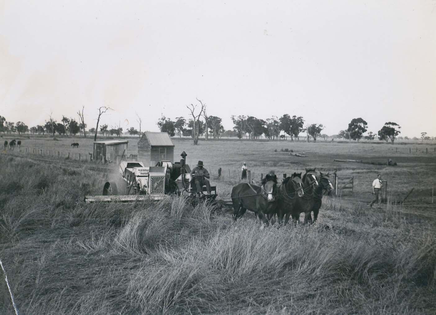 Hand written in pencil on back, ' J.W. Kerr [possibly] / Engine Function H S T HORSE DRAWN HEADER / (INVENTED BY HEADLIE SHIPARD TAYLOR)