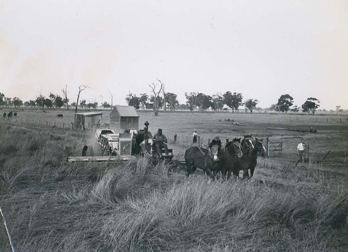 Man driving a team of four horses pulling a Sunshine Engine Functioned header harvester in a field. In the background are two small farm sheds