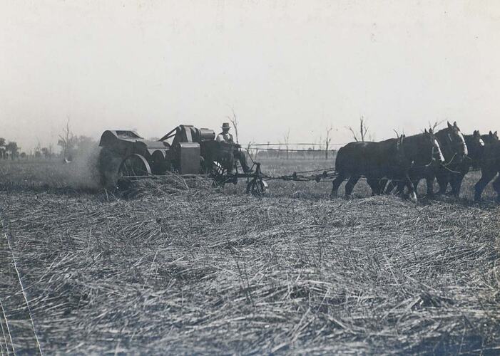 Photograph of horse drawn HST header. It is part of a collection of photographs, moving film, artefacts, documents and trade literature relating to Massey Ferguson (Aust.) Ltd. The Australian operations of this company were originally founded as Hugh V. McKay in the 1890s. In 1930 it merged with Massey Harris's Australian operations to become H.V. McKay Massey Harris Pty Ltd. In 1955, this company was in turn absorbed into the Massey-Ferguson global entity becoming Massey Ferguson (Aust.) Limited.