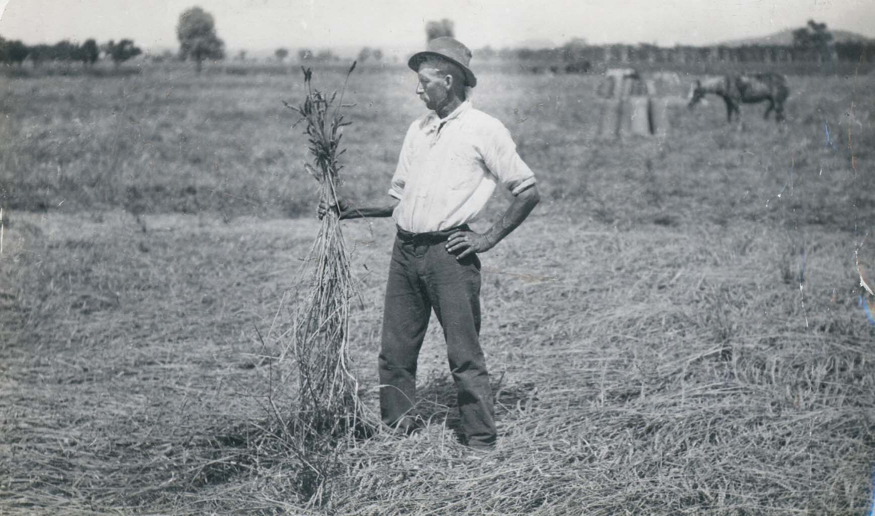 Handwritten in pencil on back, 'Mr O Perrett / "Mayfield" / Kelvin / Gunnedah / This is a companion picture to No. 2 - 3 and 4 for each / one was taken in the / same paddock. It will / be noted that the fallen / crop does not cover the / horses hoofs nor Mr / Perretts boots. In 1916 / Mr Perott burnt a similar crop as he could / not harvest it. The 'Sunlight' / Header this year gathered / over 14 bags of wheat / to the acre from it. All / Mr Perretts crop was badly / lodged but he secured / 3500 bags of wheat from / 350 acres. Rgls.' 'O Perrott / No. 1' 241 In blue stamp pad ink [upside down] 'Hugh V McKAY / per......... / Advertising Department.'