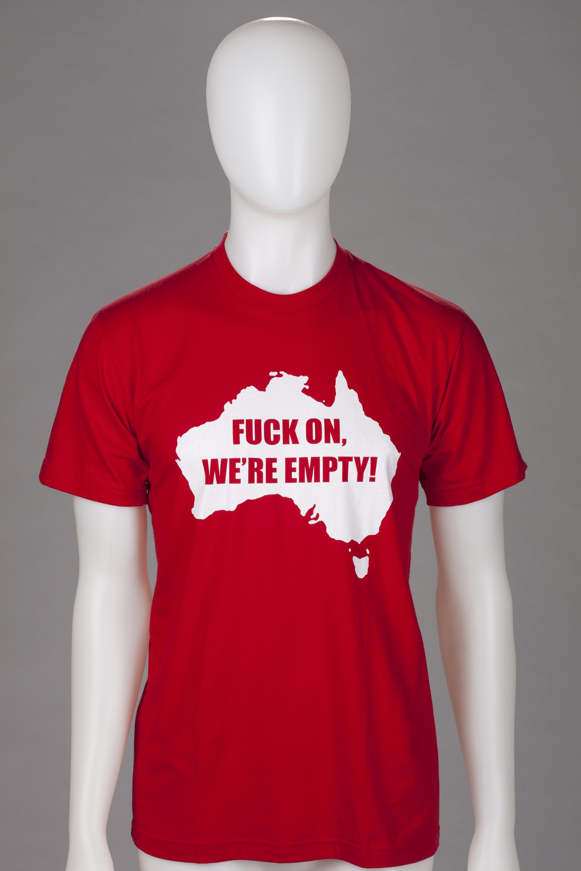 The slogan 'Fuck on we're empty' was created as a counterpoint to the racist slogans stating that Australia is 'full', especially the slogan 'Fuck off we're full' which was developed and used following the Cronulla riots of 2005. This t-shirt counteracts the racist slogan by carefully imitating its imagery, both use a white map of Australia and similar language, although the slogan 'Fuck on We're Empty', suggests that we should welcome migrants because this land is 'empty'.