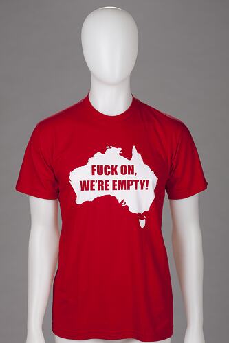 Red t-shirt designed by leakeg, circa 2009. The t-shirt features a white printed map of Australia with the slogan 'Fuck On We're Empty'. This T-shirt is an example of individual designers' and artists' efforts to counteract racism and discrimination in Australian society through the sale of anti-racist memorabilia through an independent website for exhibiting art, design and photography, called Red Bubble.