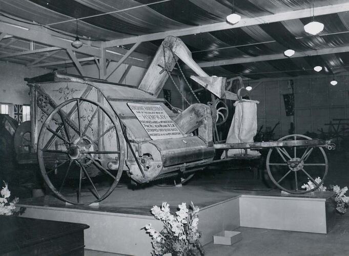 A stripper harvester inside a building on a platform with three flower vases around the base. Printed on a sign attached to the front of the harvester is the following: 'SUNSHINE HARVESTER 5FT / ONE OF THE EARLIEST MADE BY / H.V.McKAY / PURCHASED IN 1885 BY Mr ANDERSON / 'PINE HILL' NEAR MOAMA N.S.W. / STRIPPED OVER 12,000 BAGS / PRESENTED BY HIS SON Mr. R. ANDERSON'