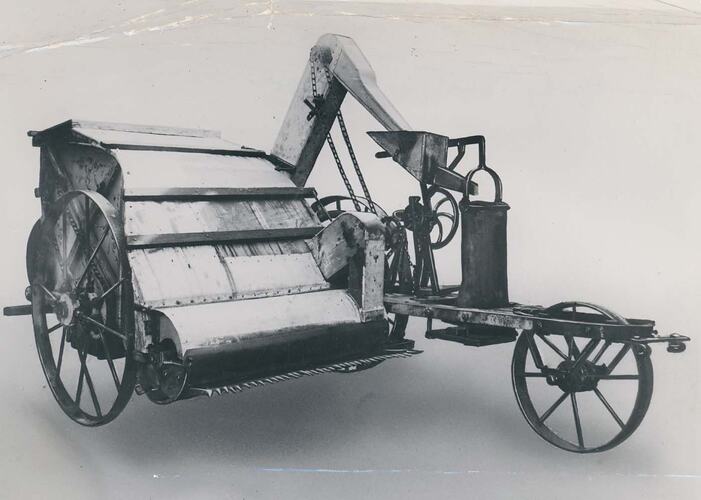 Front view of H.V McKay's earliest Stripper Harvester. One of the five Sunshine harvesters to be built under contract in 1885 by McCalman, Garde & Co, North Melbourne.