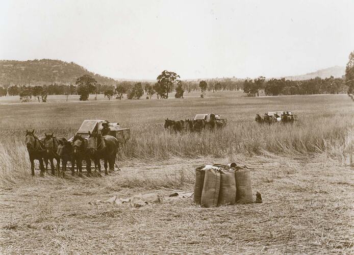 Three horse-drawn Sunshine Stripper Harvesters in a wheat field. In the foreground are bags of grain.