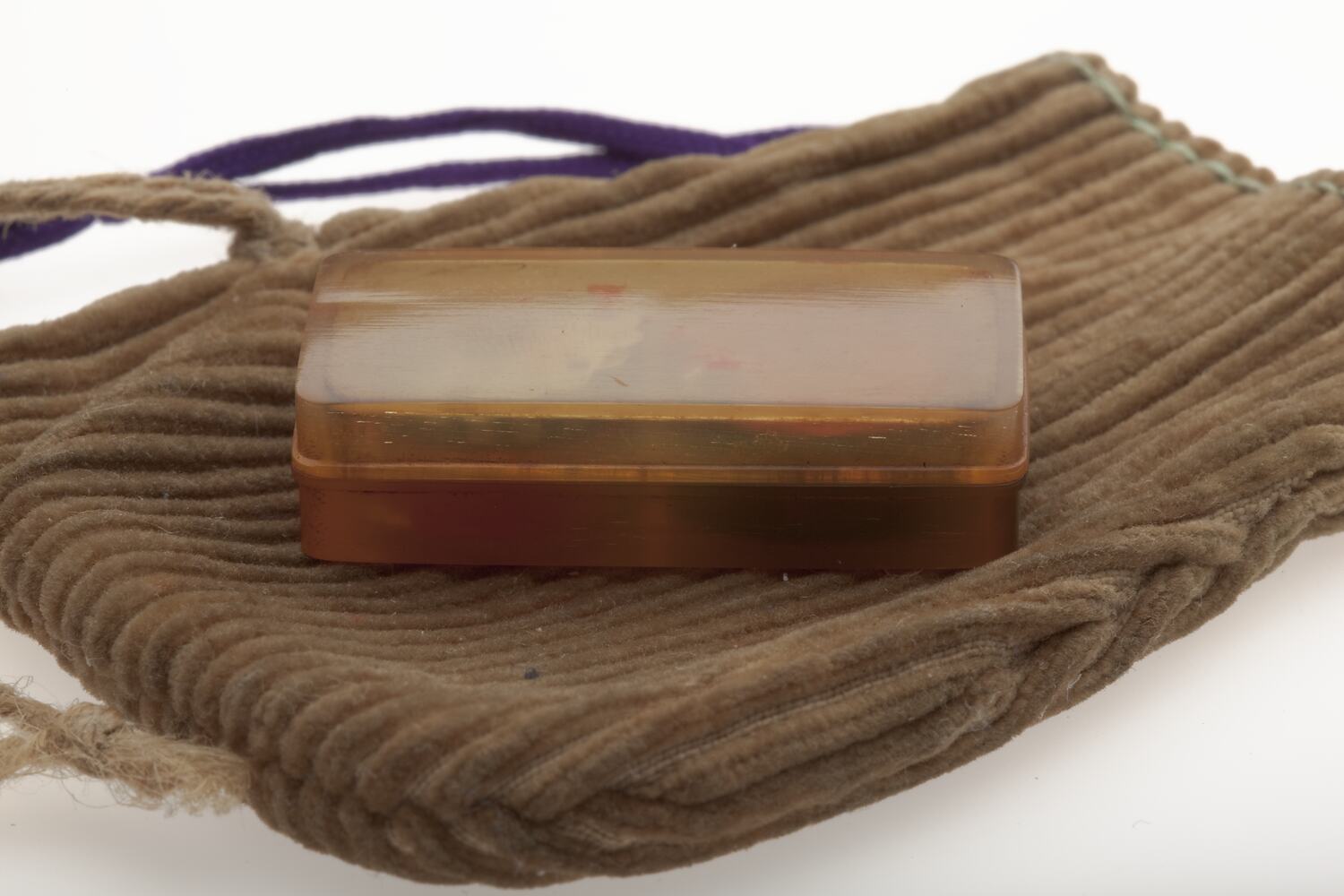 Small case in early plastic. Lid opens to reveal a round red seal with Japanese name characters with a metal hinge for removing the seal from the case and holding it. Next to the seal is a round inset container for red wax. There is also a brown corduroy pouch with brown string and purple string attached to metal ring for closing the top of the pouch.