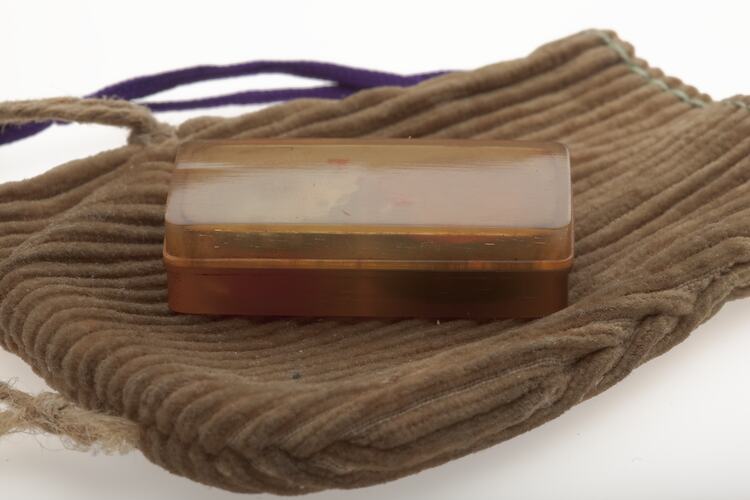 Traditional name seal and wax belonging to Setsutaro Hasegawa. It was brought out from Japan by Setsutaro Hasegawa who migrated to Australia in 1897. Hanko were initially only used by the Emperor, and from 750AD they were also used by the Japanese nobility. From 1870 onwards hanko came to be used throughout Japanese society.