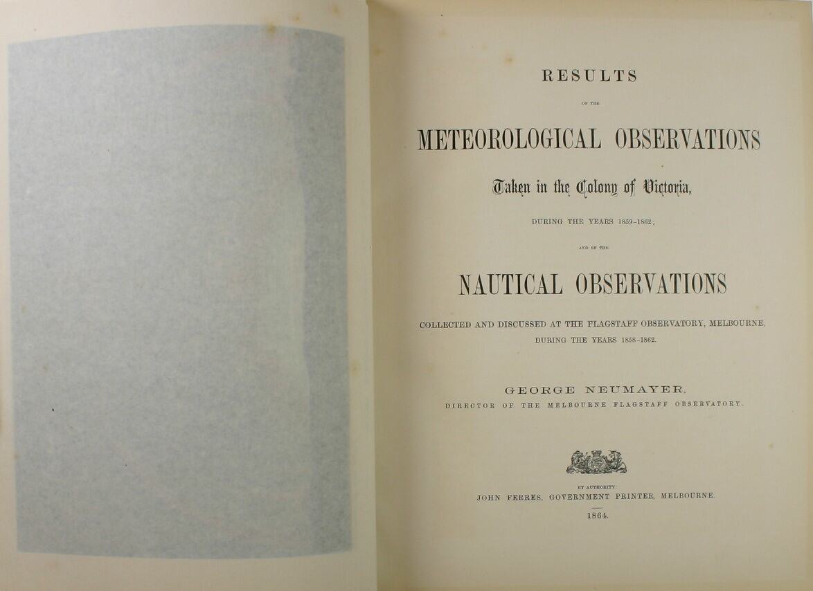 Results of the Meterological Observations taken in the Colony of Victoria, 1859-1862; and of the Nautical Observations collected at Flagstaff Observatory, Melbourne, 1858-1862. By George Neumayer, Director of the Flagstaff Observatory. Published by the Government Printer, Melbourne, 1864.