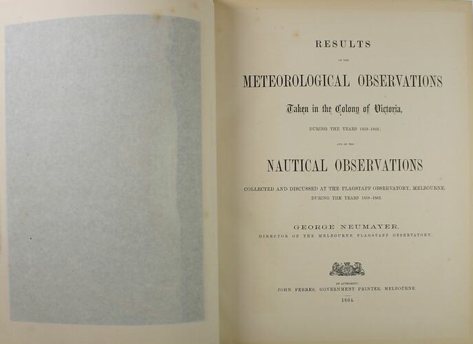 Title Page: Results of the Meteorological Observations taken in the Colony of Victoria during the years 1859-1862; and of the Nautical Observations collected and discussed at the Flagstaff Observatory, Melbourne during the years 1858-1862. / George Neumayer, Director of the Melbourne Flagstaff Observatory. / John Ferres, Government Printer, Melbourne, 1864.