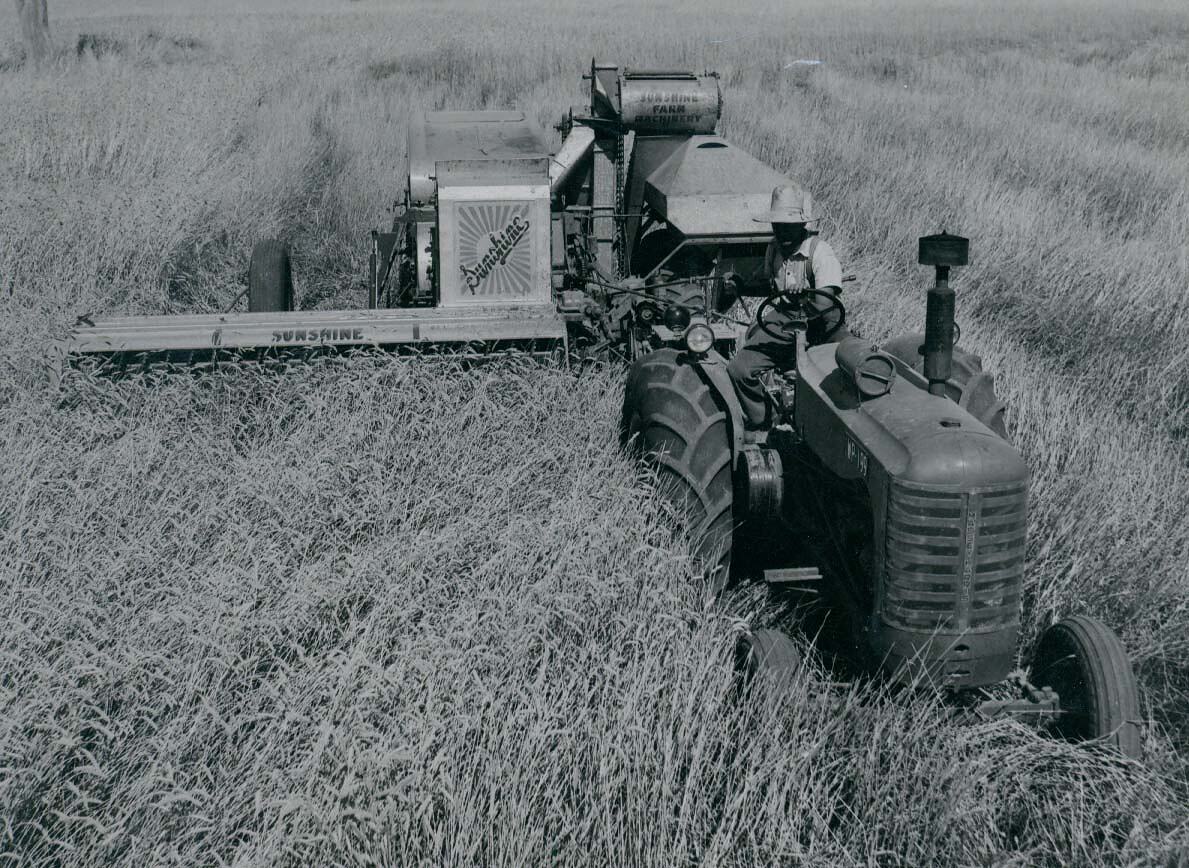 Mr.R.C. Henderson driving a Massey Harris 744D tractor coupled to a No.4 Sunshine Power Drive Header Harvester. The machines is harvesting 36 bushels of Magnet wheat to the acre.