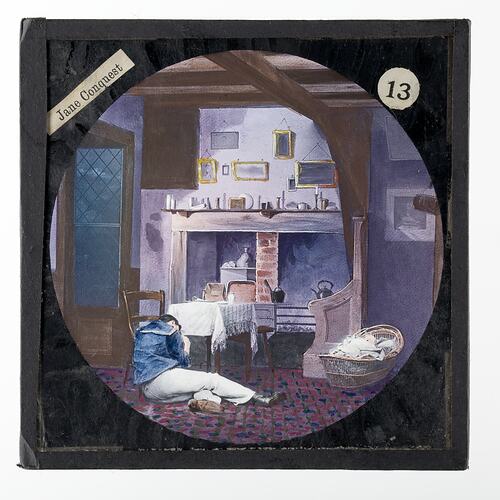 Set of sixteen magic lantern slides used in telling the story of Jane Conquest using a magic lantern projector. A booklet accompanies the set of slides. Incomplete set.