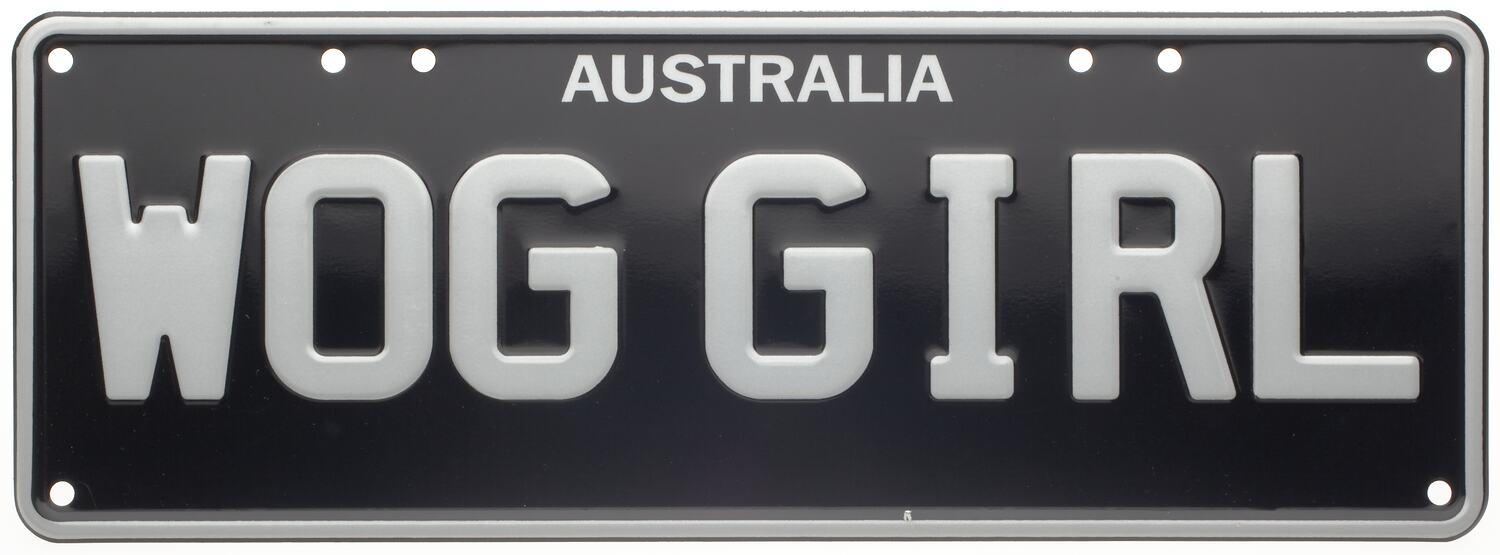This number plate show how a racist term 'wog' has been reclaimed in recent times and proudly used to broadcast a non-Anglo Australian ethnic identity. The term 'wog' and its racial underpinnings are thought to derive from the word 'golliwog' in the late 19th century. In Australian English since the 1950s, 'wog' is a slang term directed against people of Southern European, Mediterranean and Middle Eastern ancestry. More recent stereotypes of 'wogs' suggest that they take great pride in their cars, typically driving turbo, 'hotted up' cars such as V8s. The combining of the word 'wog' with the material artefact of the number plate playfully reinforces the modern stereotype of a 'wog' and is not racist if used by a self-identified 'wog'. It shows how a racist term can be reclaimed and worn with pride.