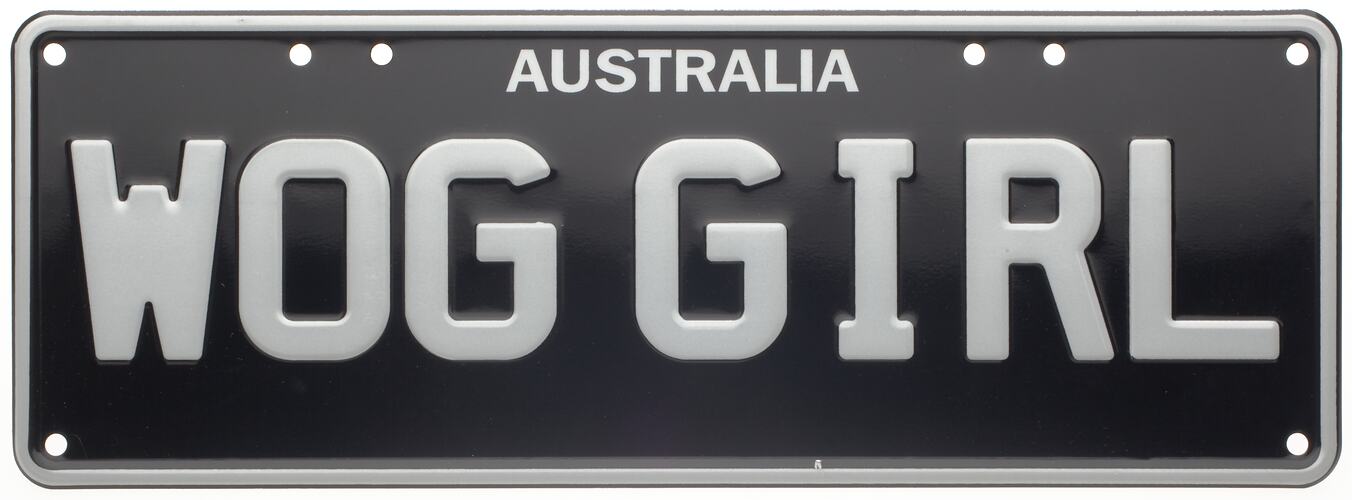 These Novelty Number Plates show how a racist term 'wog' has been reclaimed in recent times and proudly used to broadcast a non-Anglo Australian ethnic identity. The term 'wog' and its racial underpinnings are thought to derive from the word 'golliwog' in the late 19th century. In Australian English since the 1950s, 'wog' is a slang term directed against people of Southern European, Mediterranean and Middle Eastern ancestry. More recent stereotypes of 'wogs' suggest that they take great pride in their cars, typically driving turbo, 'hotted up' cars such as V8s. Number plates in Australia can be personalised to display the owner's identity and personality. These novelty number plates are a cheaper alternative and can be displayed anywhere, not just on a vehicle. The combining of the word 'wog' with the material artefact of the number plate playfully reinforces the modern stereotype of a 'wog' and is not racist if used by a self-identified 'wog'. The number plates are examples of how a racist term can be reclaimed and worn with pride.