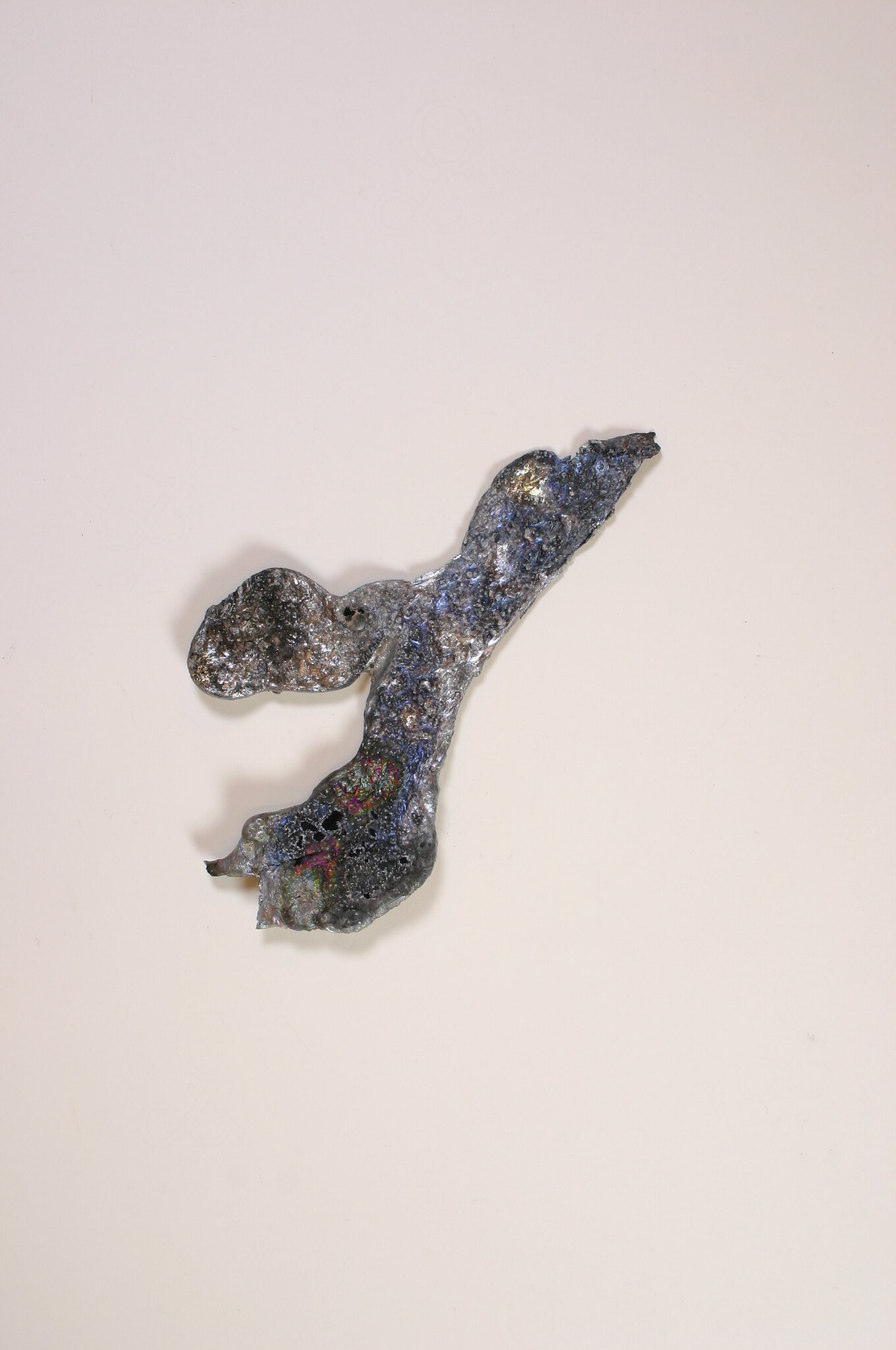 Irregular shaped lump of melted metal, probably aluminium. The metal is scattered with ash and debris from other burnt matter, particularly on the underside.