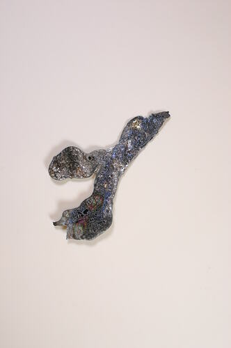 Large lump of melted metal, probably aluminium, from an alloy wheel. It came from the remains of a camper trailer which was stored at Bob and Ercil McIlvena's property at Haven, near Horsham. The camper trailer was destroyed by the Vectis (Remlaw) Bushfire on 7 February, 2009.