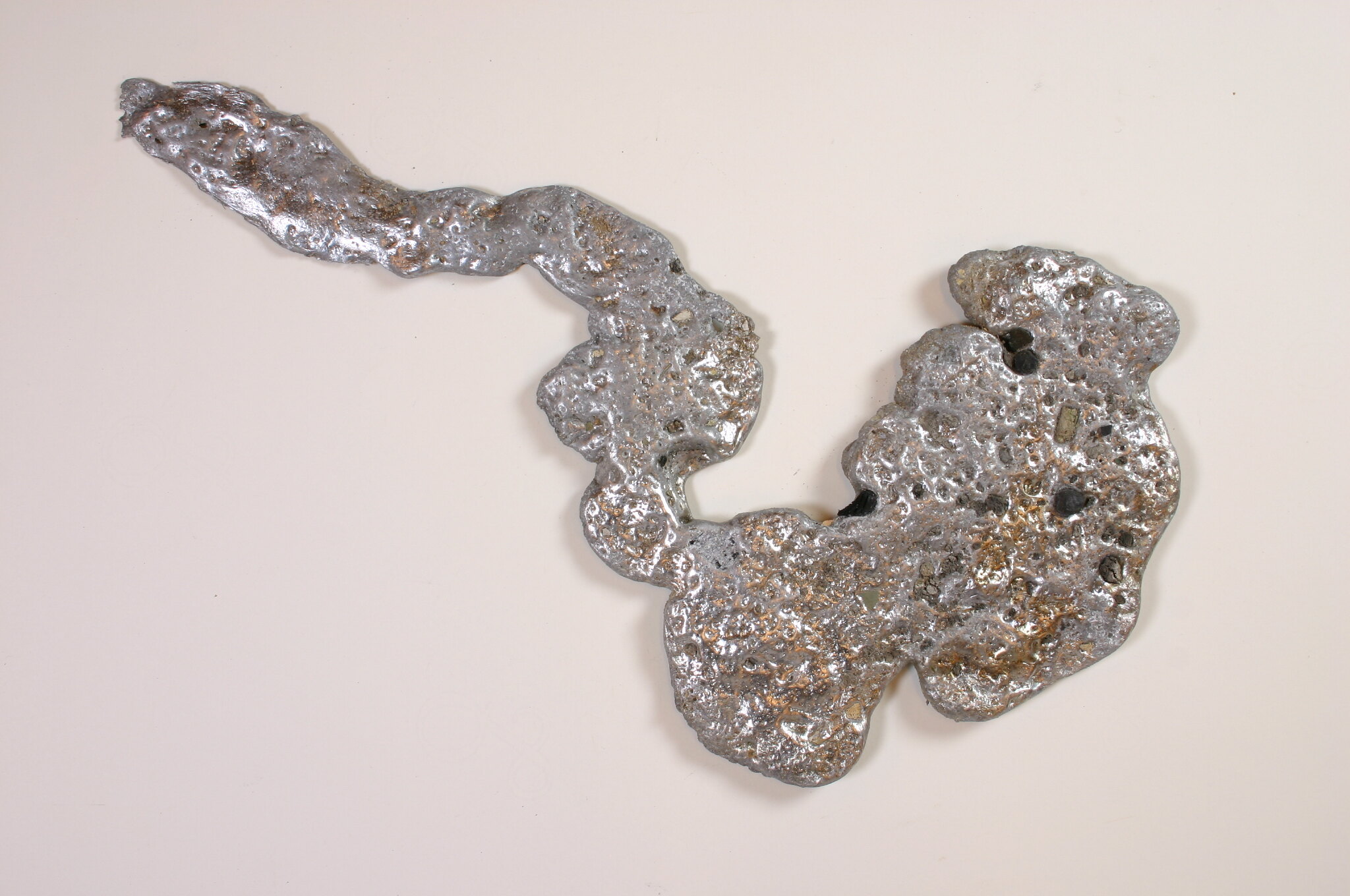 Irregular shaped lump of melted metal, probably aluminium. Metal is scattered with small stones and ash and other debris from other burnt matter.