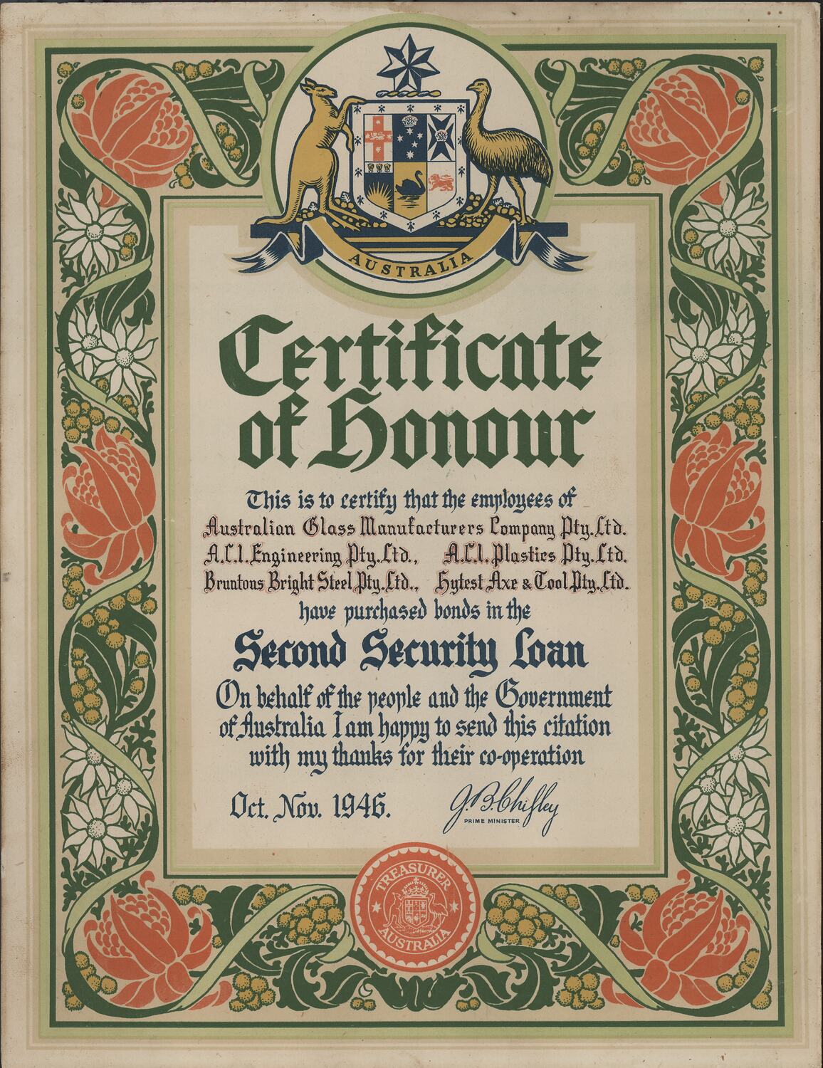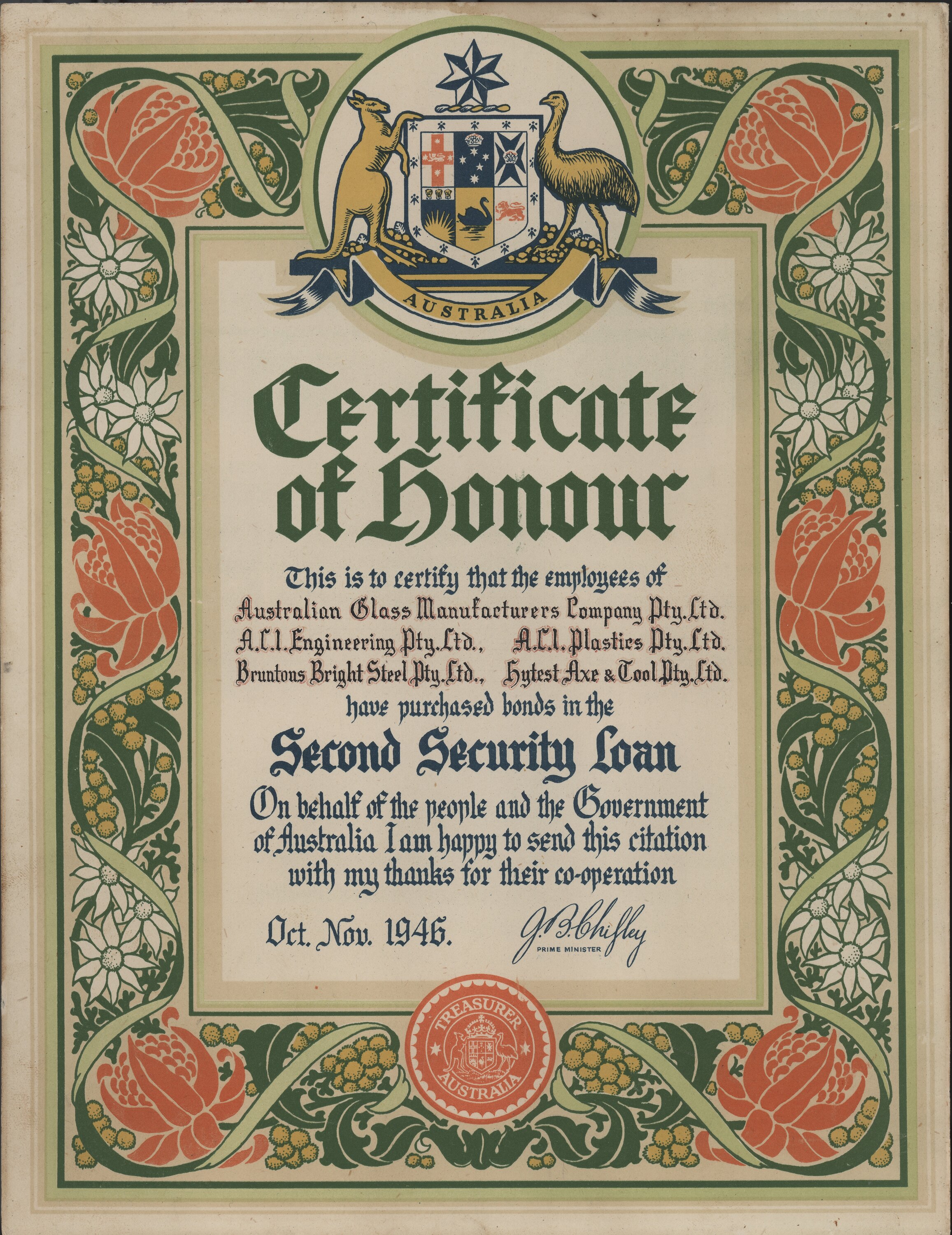Printed: AUSTRALIA; Certificate of honour/ This is to certify that the employees of/ Australian Glass Manufacturing Company Pty. Ltd./ A.C.I. Engineering Pty. Ltd., A.C.I. Plastics Pty. Ltd./ Bruntons Bright Steel Pty. Ltd., Hytex Axe & Tool Pty. Ltd./ have purchased bonds in the/ Second Security Loan/ On behalf of the people and the Government/ of Australia I am happy to send this citation/ with my thanks for their cooperation/ Oct. Nov. 1946. J.B. Chifley/ PRIME MINISTER; TREASURER AUSTRALIA