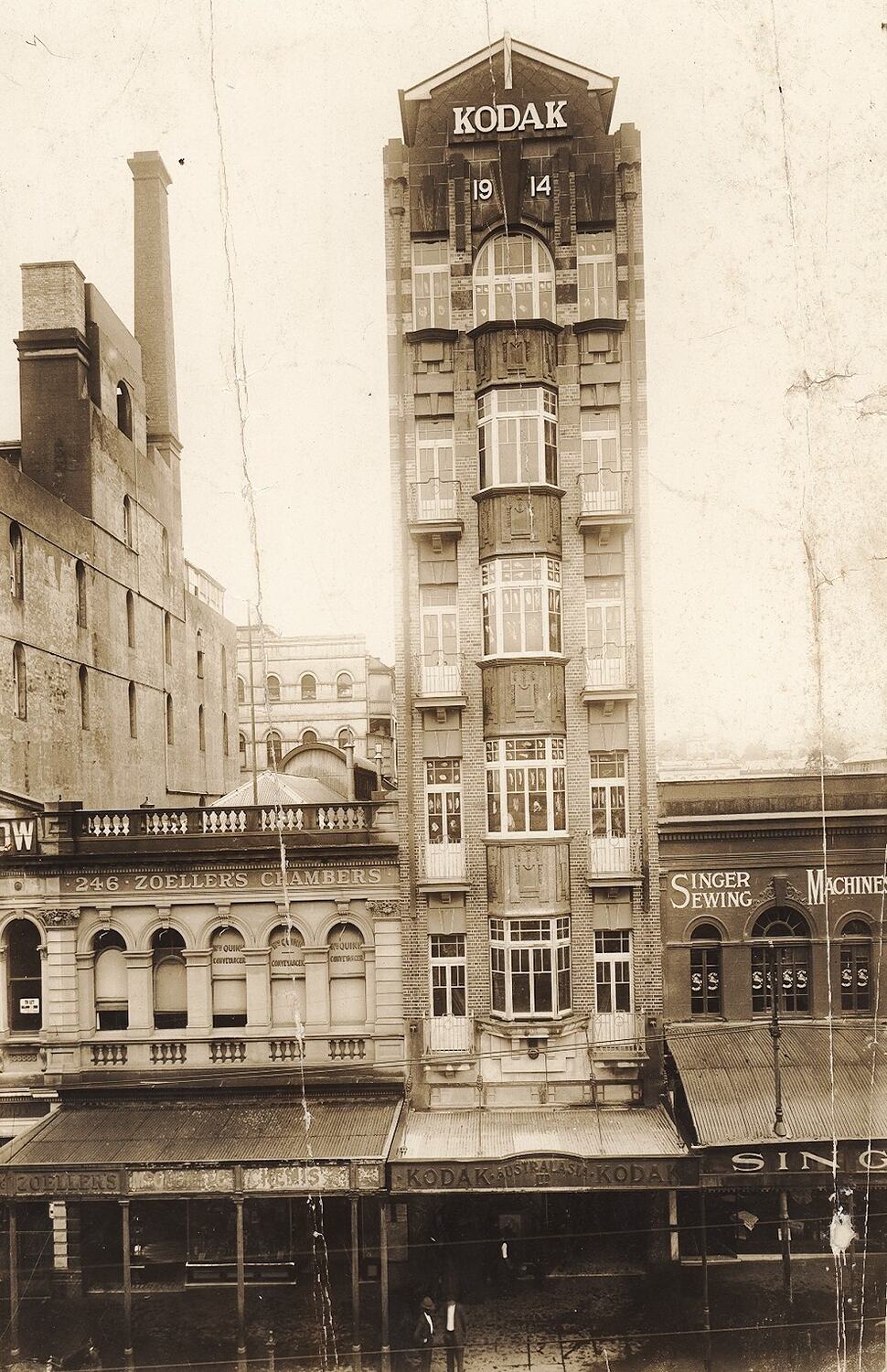At the centre of this photograph of a streetscape is a building with '"KODAK 1914" signage at the top while on the awning of the shopfront is the signage, "KODAK AUSTRALASIA KODAK". To the left is a building with the signage "ZOELLER'S CHAMBERS", lawyers' offices. To the right is a retail shop selling Singer's Sewing Machines. There is a group of people at street level in front of the Kodak shop.