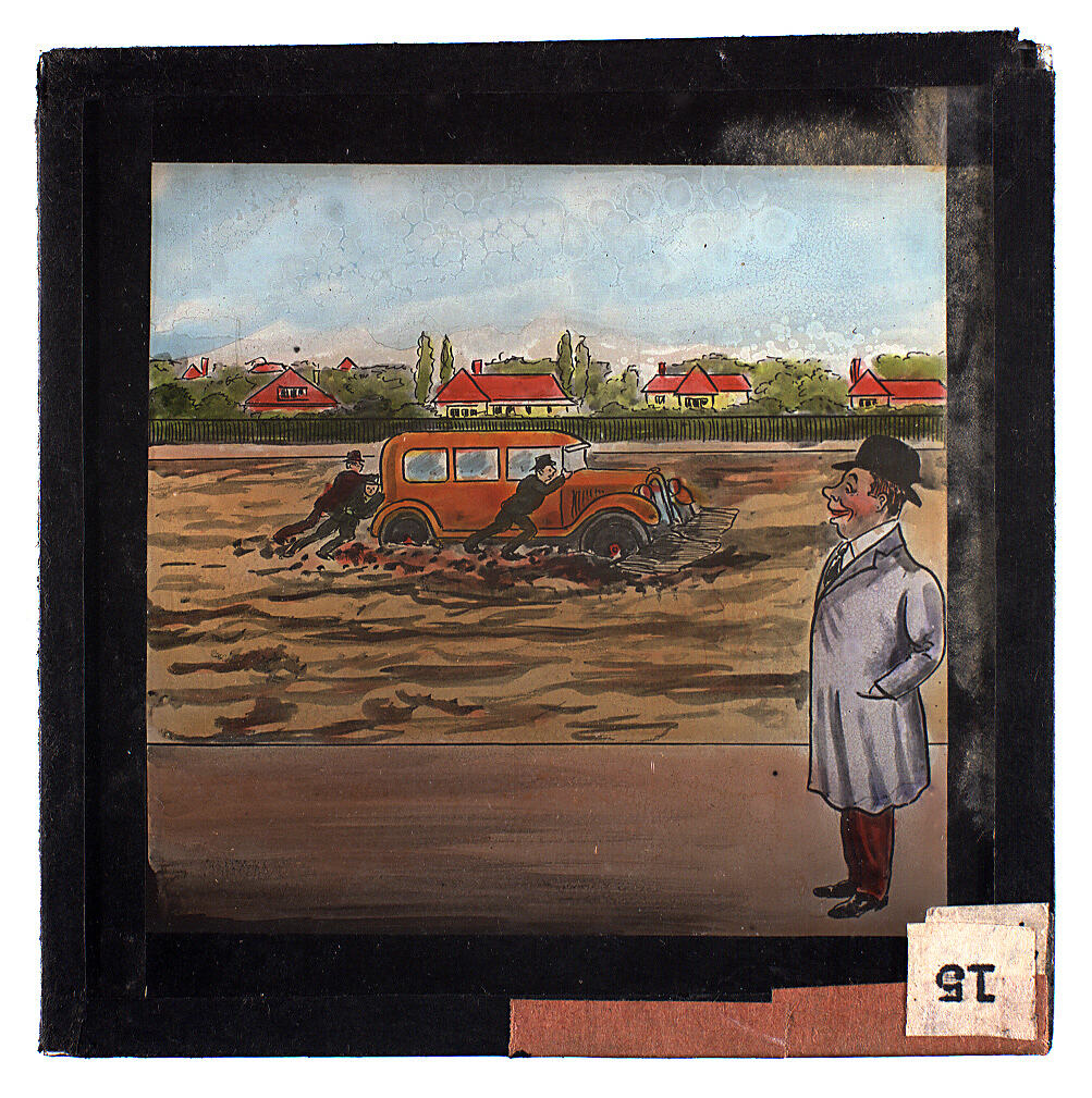 Colour glass lantern slide of a cartoon sketch of man watching others push a car out of mud.
