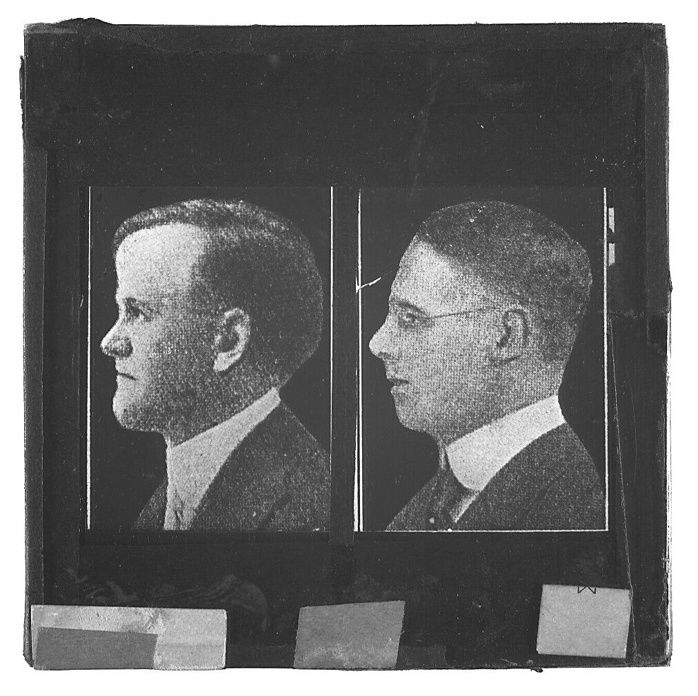 Glass lantern slide of photographs of two male heads in profile.