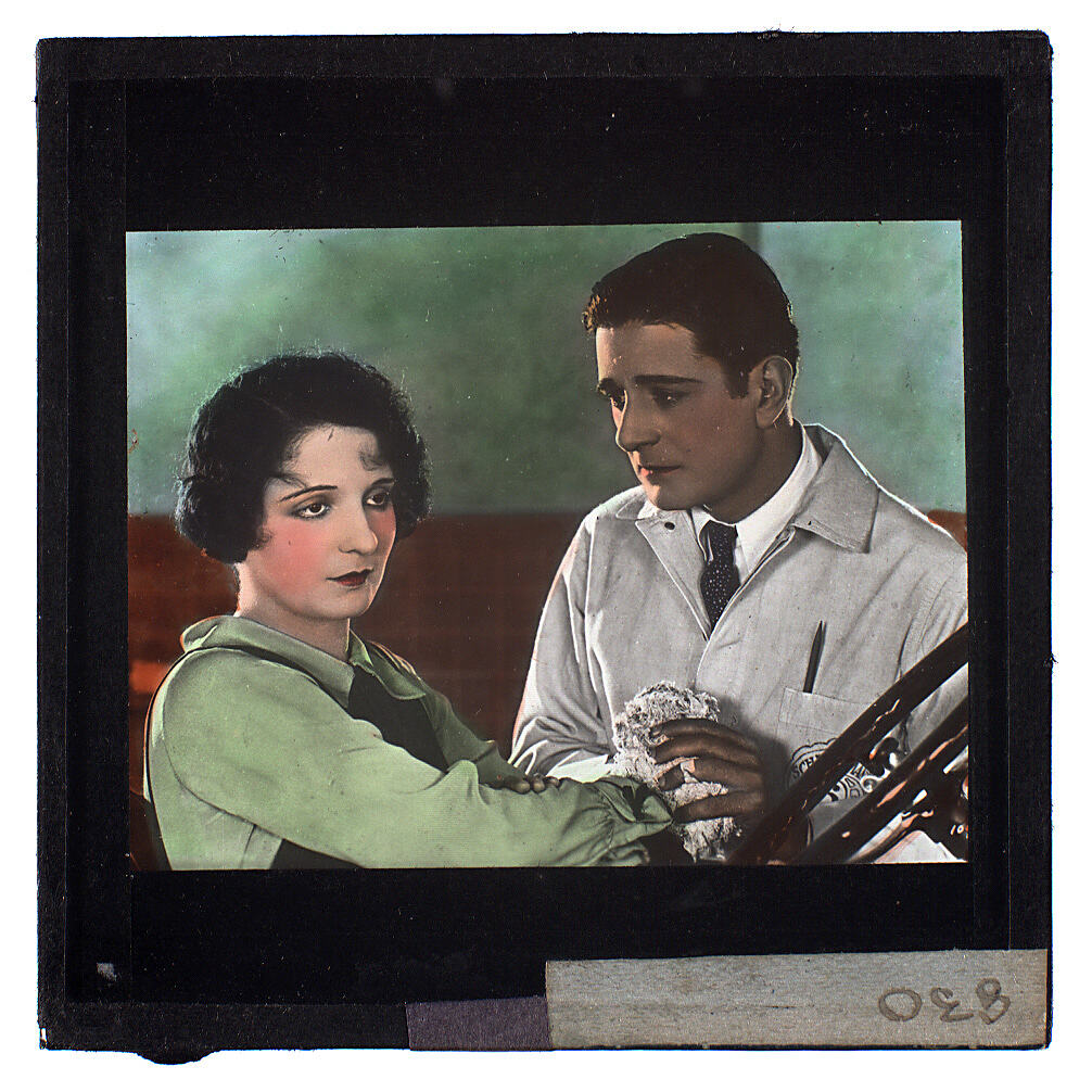 Coloured lantern slide. Image is of a man holding the hands of a woman who is wearing a green dress. A car steering wheel is in the bottom left of the image.