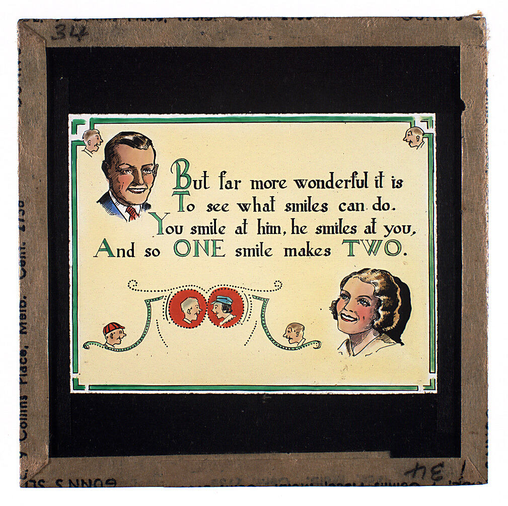 Lantern slide of illustration of a man and woman, with a poem extolling the power of smiles. Made by Alex. Gunn & Sons, Melbourne, Victoria, circa 1930s.