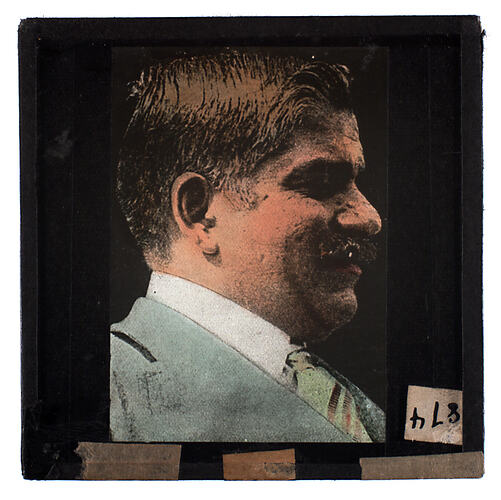 One of a set of over 420 lantern slides, used by lecturer Walter S. Binks, a popular psychology and vocational guidance lecturer based in Melbourne, Victoria. Binks gave lectures throughout Australia in the 1930s and 1940s. Binks advertised his lectures as associated with the Australasian Opportunity League or Universal Opportunity League. Binks often used portraits of famous men or distinctive looking faces to discuss his beliefs in the relationship between physiognomy and personality.
