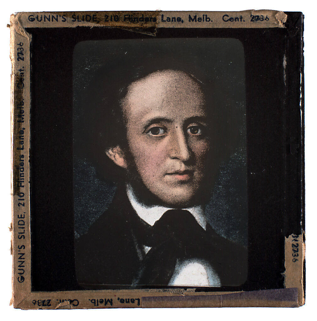 One of a set of over 420 lantern slides, used by lecturer Walter S. Binks, a popular psychology and vocational guidance lecturer based in Melbourne, Victoria. Binks gave lectures throughout Australia in the 1930s and 1940s. Binks advertised his lectures as associated with the Australasian Opportunity League or Universal Opportunity League. Binks often used portraits of famous men or distinctive looking faces to discuss his beliefs in the relationship between physiognomy and personality.