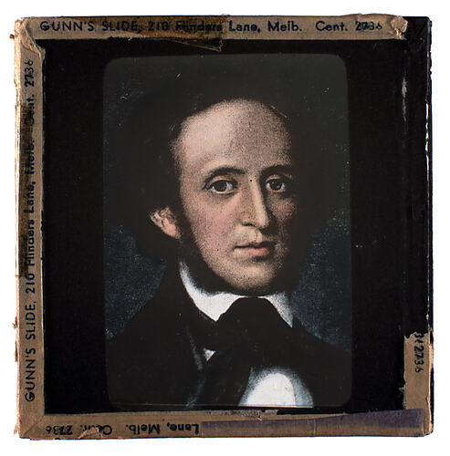 Lantern slide of photographic portrait of a man. Made by Alex. Gunn & Sons, Melbourne, Victoria, circa 1940s.