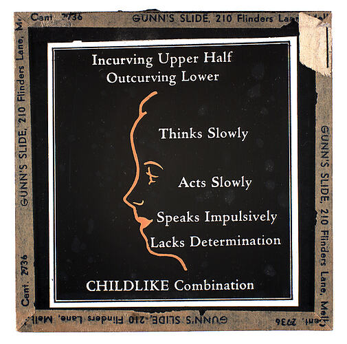 Text, edge of slide: 'GUNN'S SLIDE, 210 Flinders Lane, Melb. Cent. 2736'. Text, on slide: 'Incurving Upper Half/Outcurving Lower/Thinks Slowly/Acts Slowly/Speaks Impulsively/Lacks Determination/CHILDLIKE Combination'.