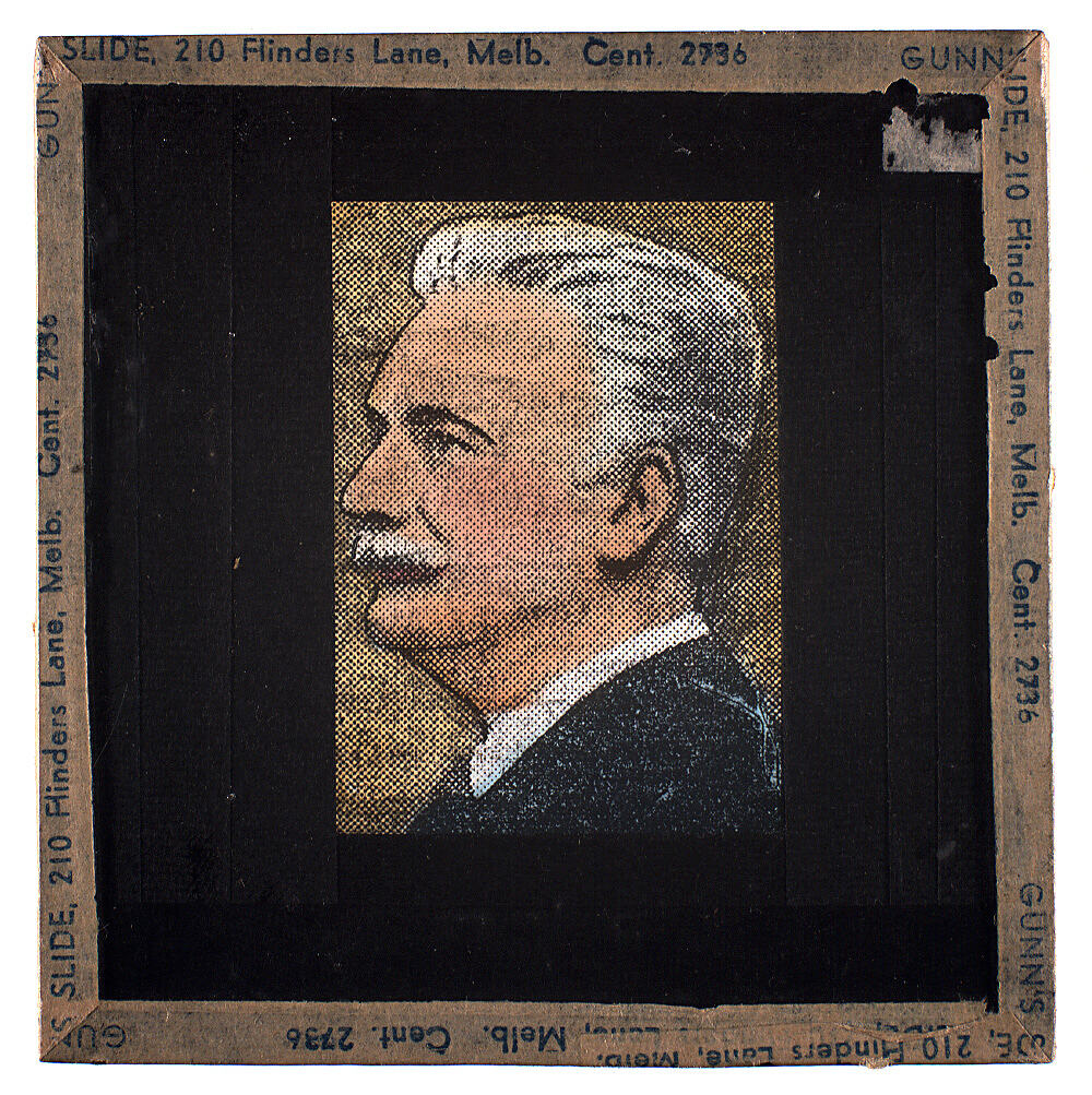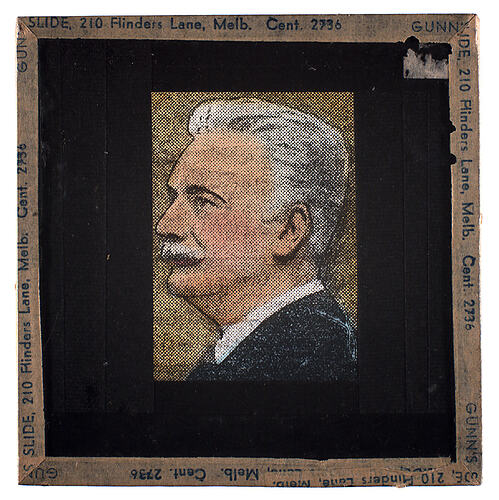 Lantern slide of photographic portrait of a man. Made by Alex. Gunn & Sons, Melbourne, Victoria, circa 1940s.