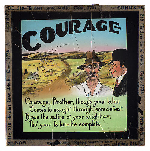 Text, edge of slide: GUNN'S SLIDE, 210 Flinders Lane, Melb. Cent. 2736. Text, on slide: COURAGE/Courage, Brother, though your labor/Comes to naught through sore defeat./Brave the satire of your neighbour,/Tho' your failure be complete.