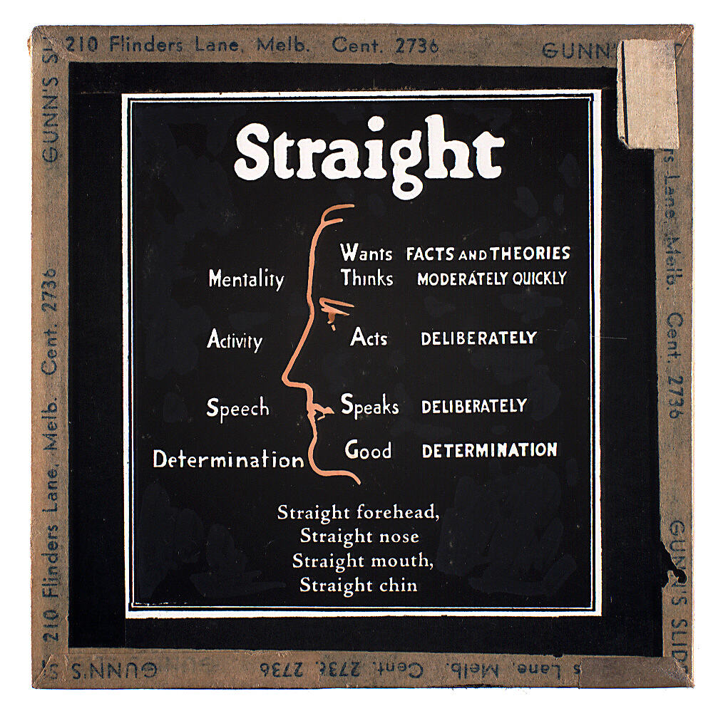 Text, on slide: Straight/Mentality/Wants FACTS and THEORIES/Thinks MODERATELY QUICKLY/Activity/Acts DELIBERATELY/Speech/ Speaks DELIBERATELY/Determination/ Good DETERMINATOR/Straight forehead/Straight nose/Straight mouth/Straight chin. Text, edge of slide: GUNN'S SLIDE, 210 Flinders Lane, Melb. Cent. 2736.