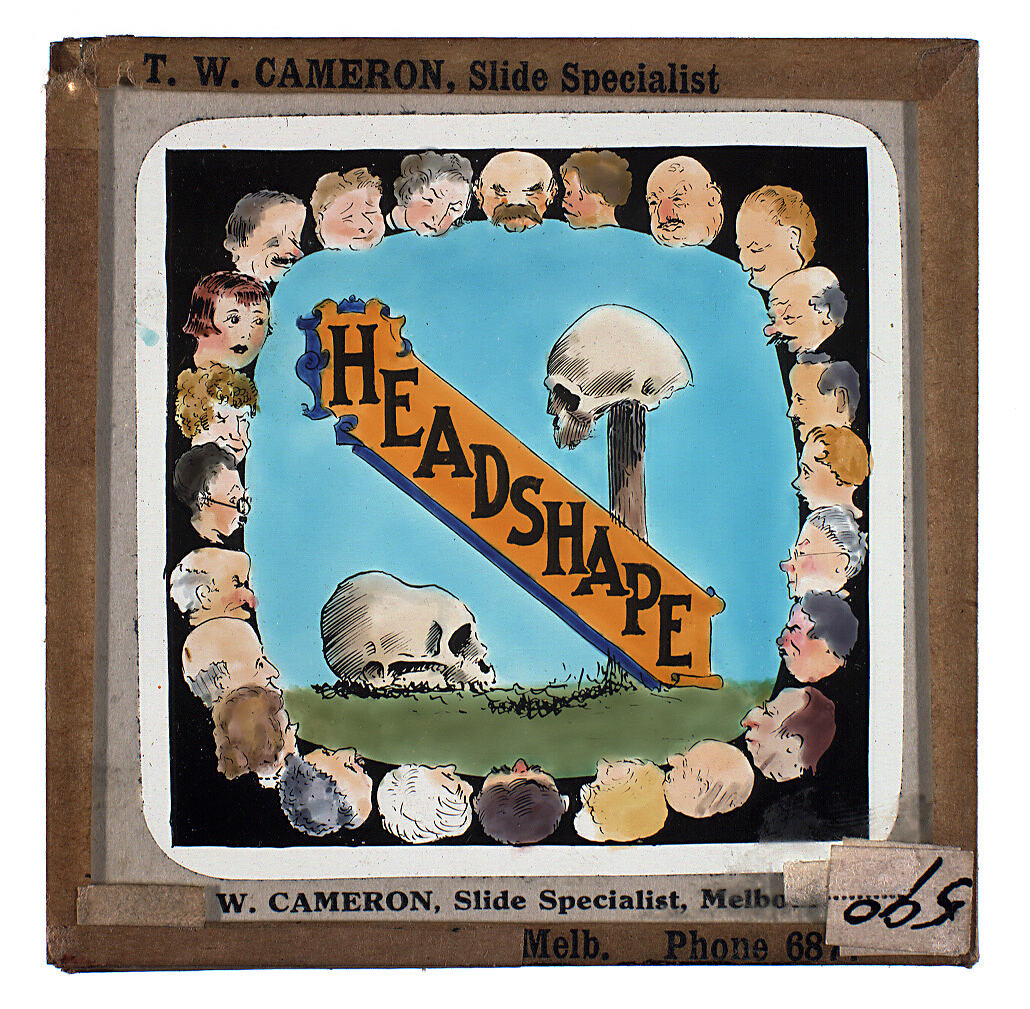 Lantern slide of a cartoon titled 'Headshape'. Made by T.W. Cameron, Melbourne, Victoria, circa 1930s-1940s.