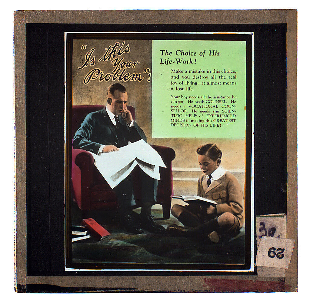 Colour glass lantern slide of father and son, and text promoting the importance of selecting the correct vocation. Made by Alex. Gunn & Sons, Melbourne, Victoria, circa 1930s.