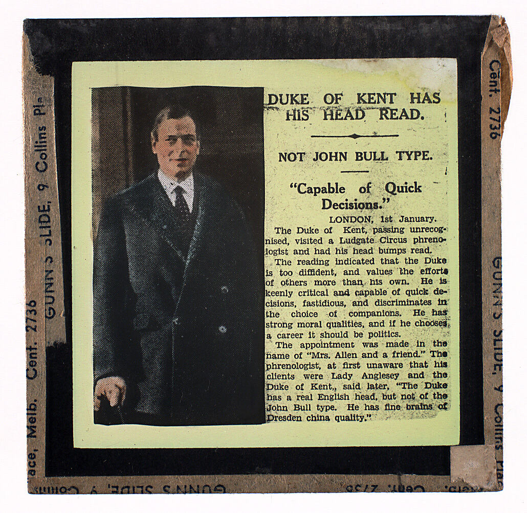Colour glass lantern slide of a press clipping from early January 1937, reporting the visit by the Duke of Kent to a London phrenologist. Made by Alex. Gunn & Sons, Melbourne, Victoria, circa 1938.
