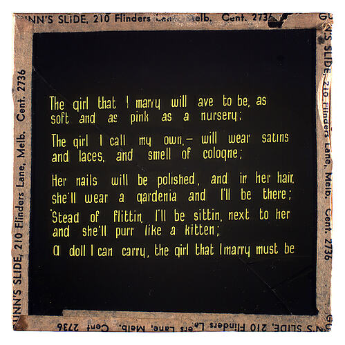 Text, on slide: The girl that I marry will have to be, as/soft and as pink as a nursery/The girl I call my own, - will wear satins/and laces, and smell of cologne./Her nails will be polished, and in her hair/she'll wear a gardenia and I'll be there;/Stead of flittin, I'll be sittin, next to her/and she'll purr like a kitten,/A doll I can carry, the girl that I marry must be. Text, edge of slide: GUNN'S SLIDE, 210 Flinders Lane. Melb. Cent. 12736.