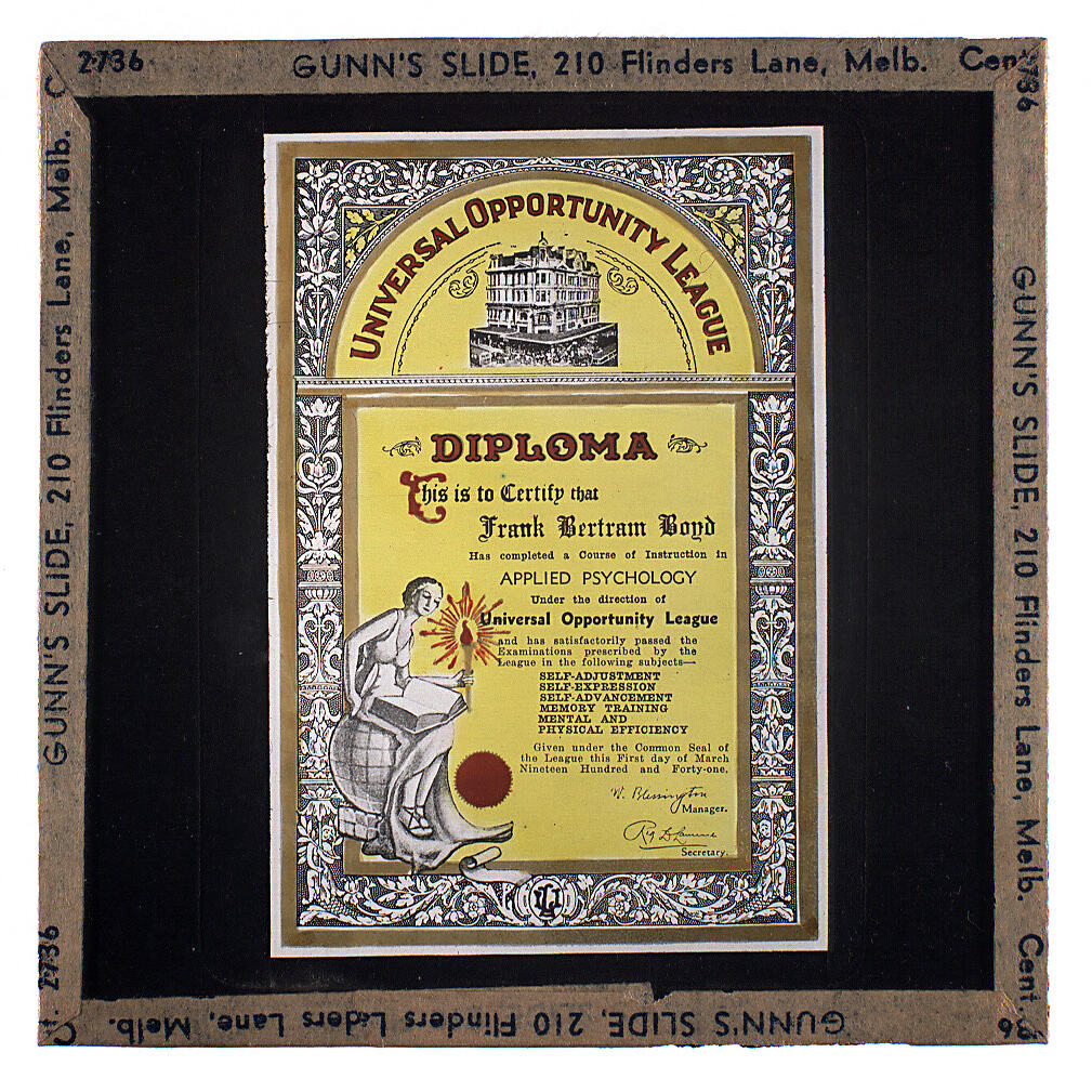 Text, on slide: UNIVERSAL OPPORTUNITY LEAGUE/DIPLOMA/This is to Certify/Frank Bertram Bond/Has completed a Course of Instruction in/APPLIED PSYCHOLOGY/Under the direction of/Universal Opportunity League. Text, edge of slide: GUNN'S SLIDE, 210 Flinders Lane, Melb. Cent. 2736.