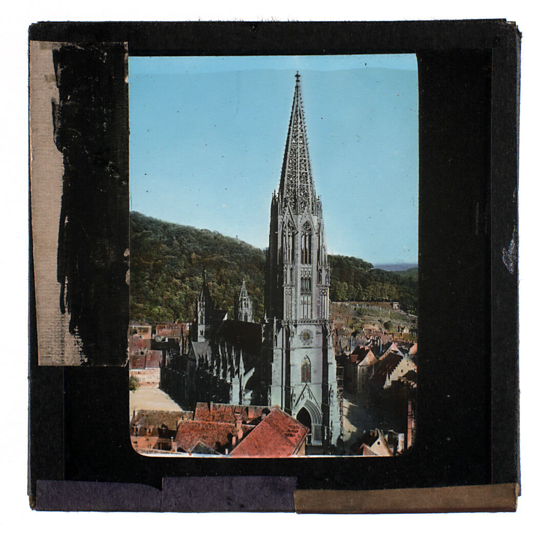 Colour glass lantern slide showing a gothic church at the foot of a mountain, possibly in Switzerland or France.