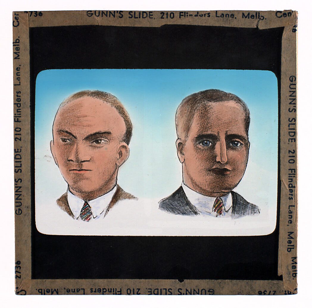 Colour glass lantern slide of a sketch of two male heads. Made by Alex. Gunn & Sons, Melbourne Victoria, circa 1940s.