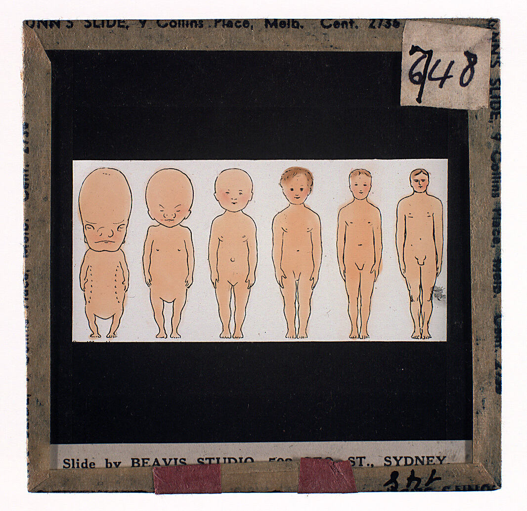 Colour glass lantern slide showing six stages of growth of human male, from foetus to adult. Made by Alex. Gunn & Sons, Melbourne Victoria, circa 1930s.