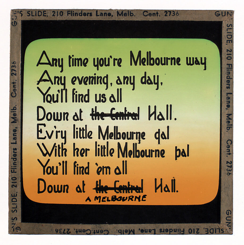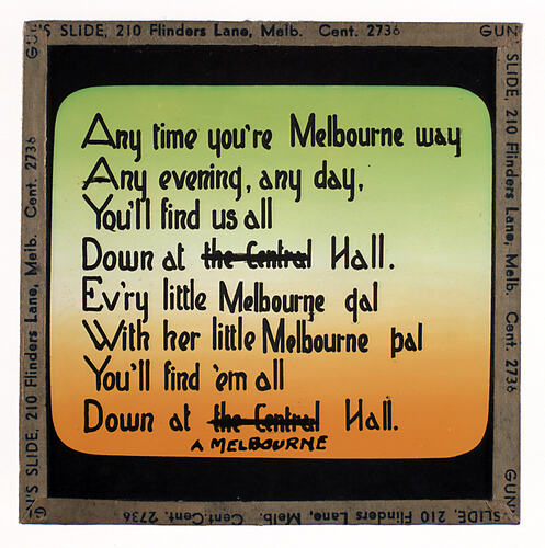 Text, on slide: Any time you're Melbourne way/Any evening, any day,/You'll find us all/Down at the Central Hall./Ev'ry little Melbourne gal/With her little Melbourne pal/You'll find 'em all/Down at A MELBOURNE Hall. Text, edge of slide: GUNN'S SLIDE, 210 Flinders Lane, Melb. Cent. 2736.