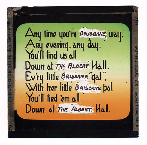 Text, on slide: 'Any time you're BRISBANE way/Any evening, any day/You'll find u s all/Down at THE ALBERT Hall/Ev'ry Little BRISBANE gal/With her little BRISBANE pal/You'll find 'em all/Down at THE ALBERT Hall.' Text on slide binding: 'GUNN'S SLIDE, 210 Flinders Lane, Melbourne. Cent. 2736'