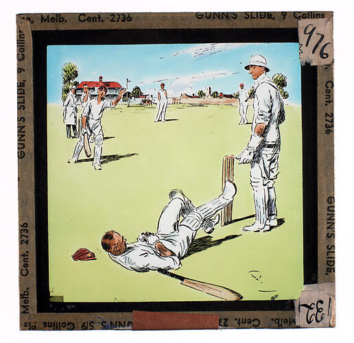 Colour glass lantern slide of a cartoon sketch of men playing cricket. The batsmen has fallen to the ground in pain; the wicketkeeper stands watching unsympathetically. Made by Alex. Gunn & Sons, Melbourne, Victoria, circa 1930s.
