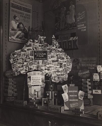 Black and white photograph featuring a close up of a section of a Kodak Australasia Pty Ltd shop front window display circa 1930s, promoting Kodak film. There is a map of Australia made from snapshot photographs and various signs, posters and products in the window promoting various Kodak products and services
